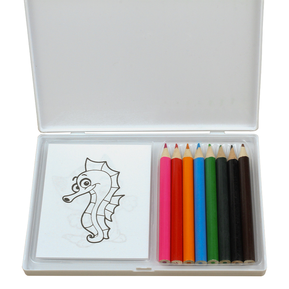 A fun, compact colouring pad featuring animals, complete with 8 vibrant pencils, all neatly packed in a white plastic case - perfect for creativity anytime, anywhere.