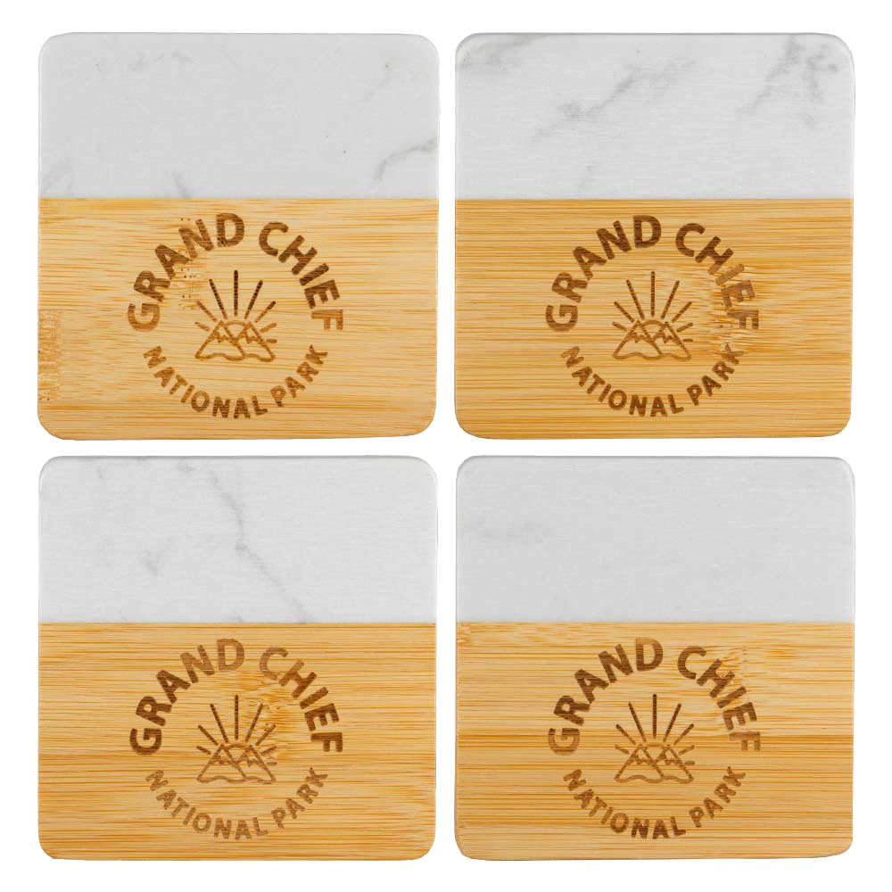 This chic four piece coaster set is crafted from marble and bamboo. The coasters are square with rounded corners.