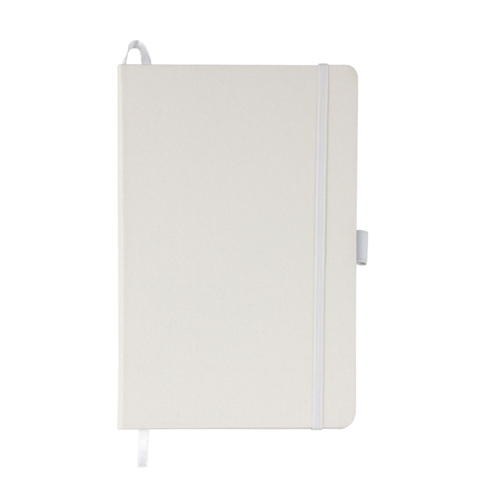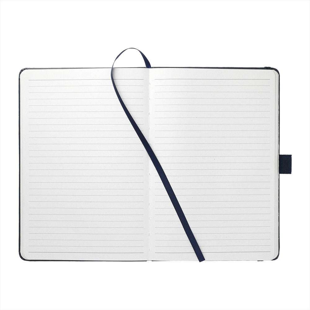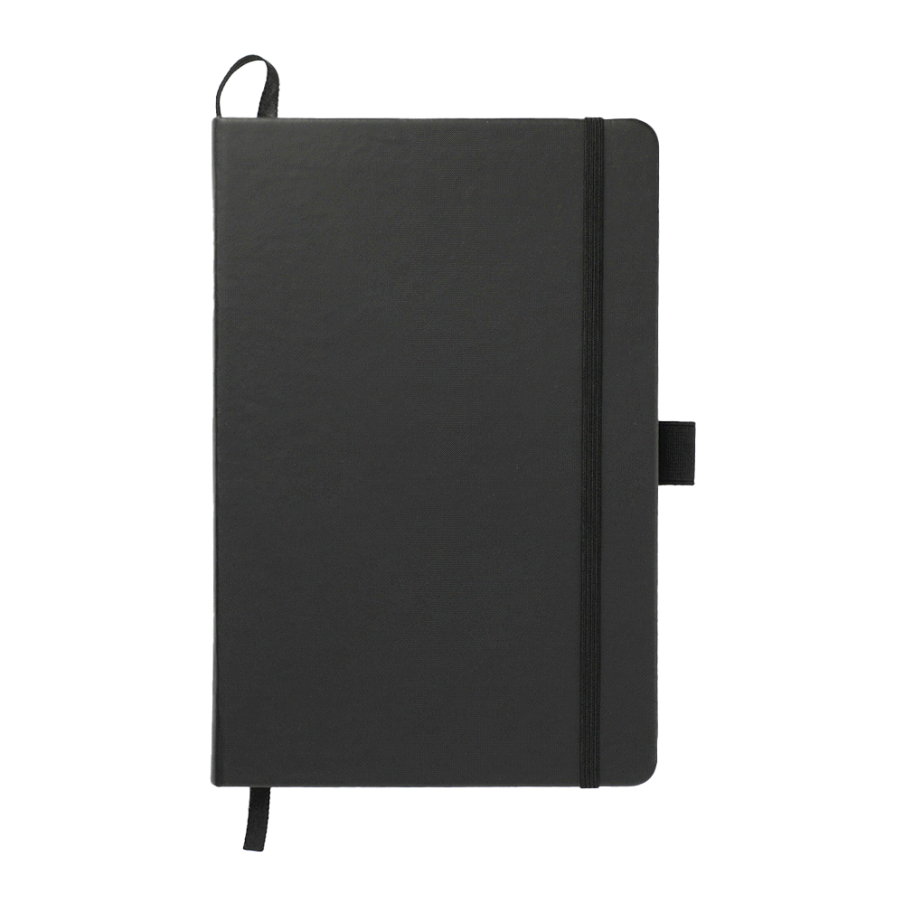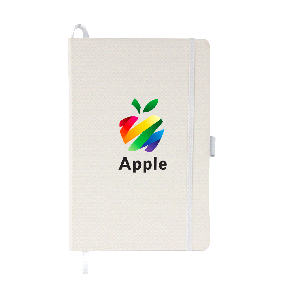 The mela recycled JournalBook ® presents a uniquely crafted hardcover, color-matching elastic closure, pen loop, and ribbon page marker, with 39% of apple components.