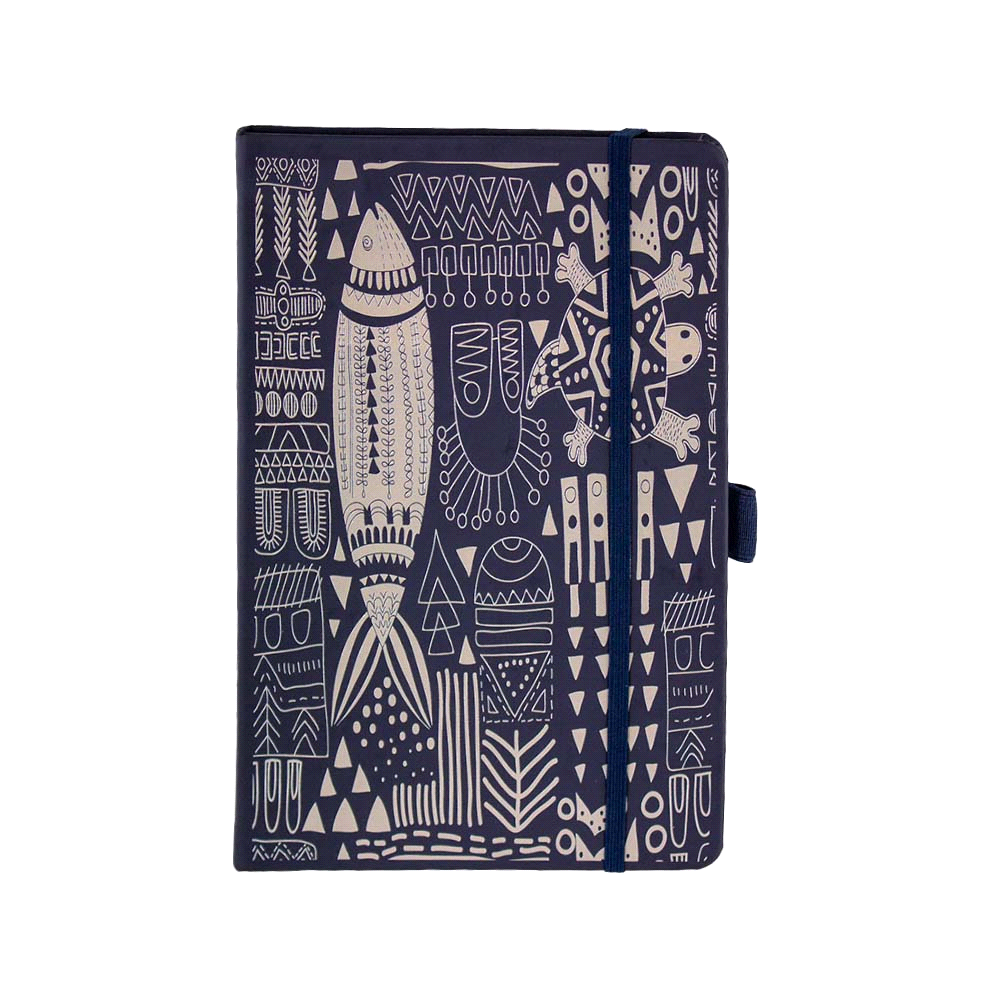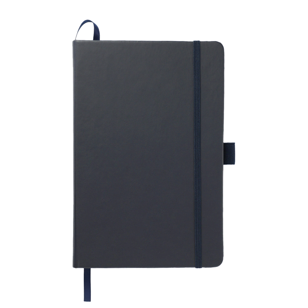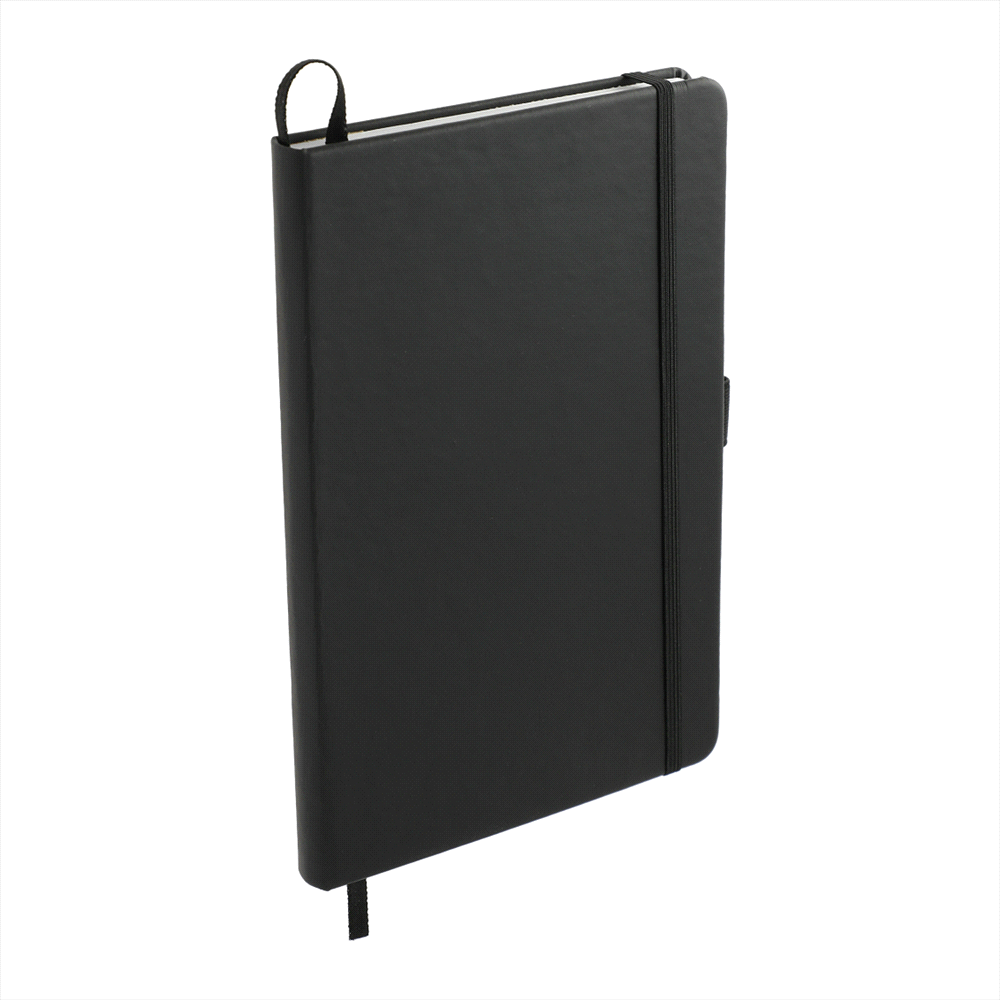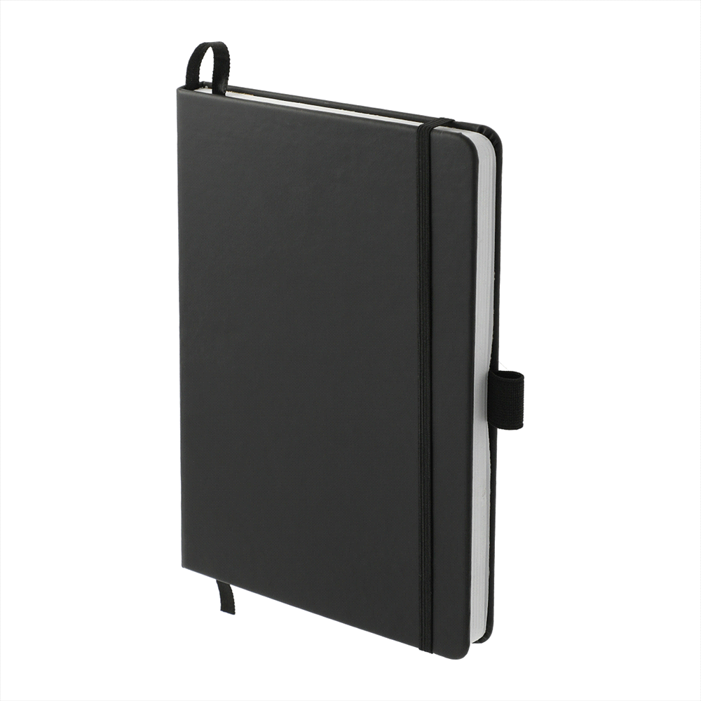 The mela recycled JournalBook ® presents a uniquely crafted hardcover, color-matching elastic closure, pen loop, and ribbon page marker, with 39% of apple components.
