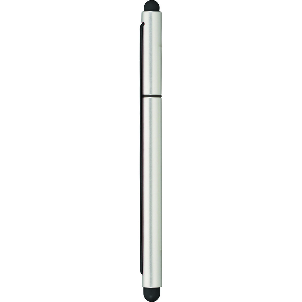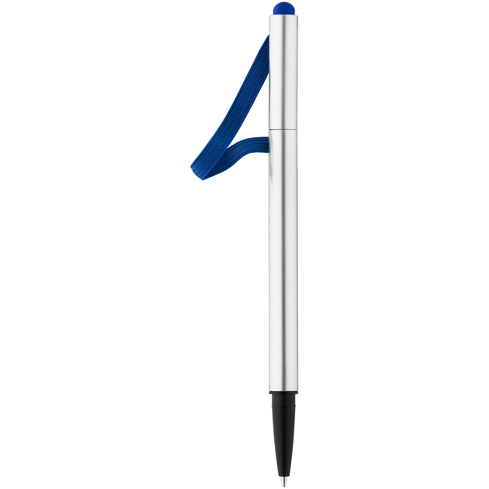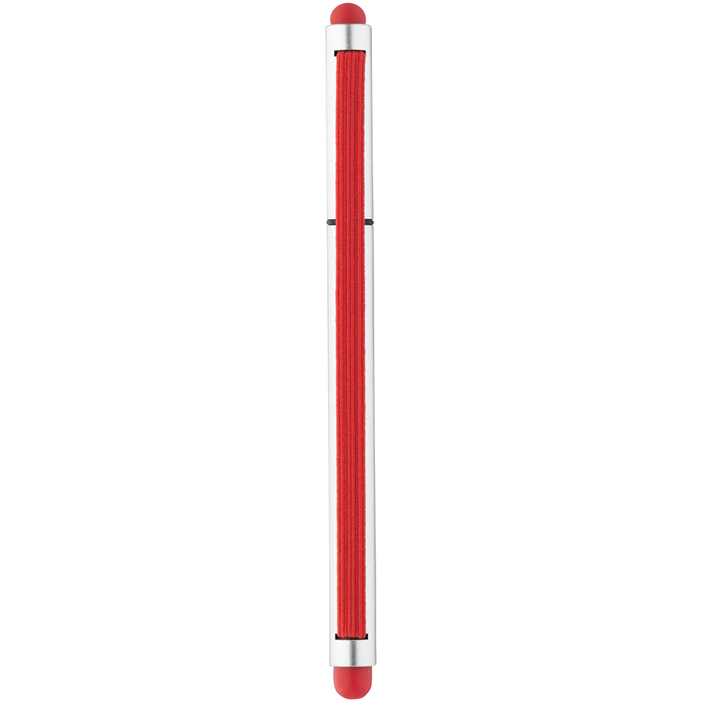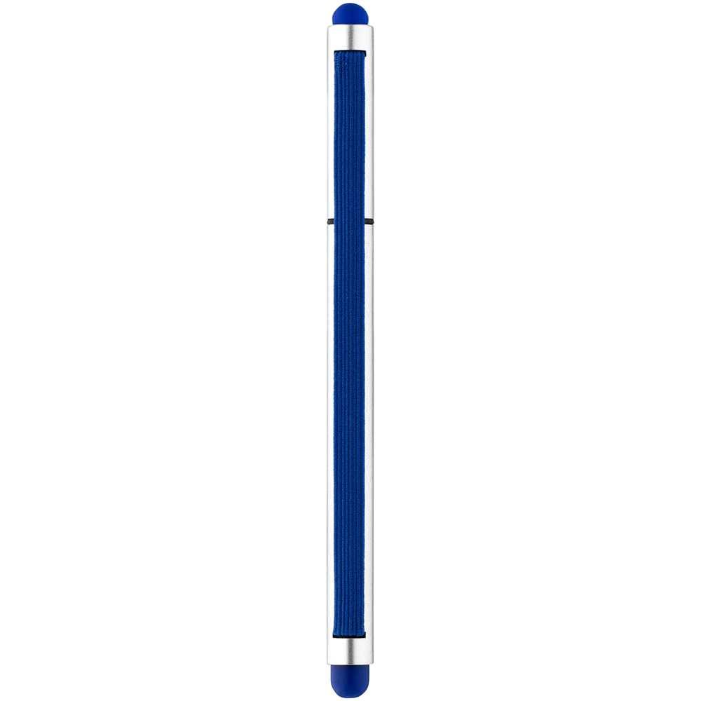 Lid top plastic pen with stylus tip on one end and elastic trim.
